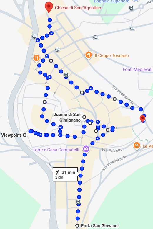 From the gate, we follow Via San Giovanni, the town’s main street leading toward the historic center. This lively stretch is lined with artisan shops, wine boutiques, and cafés, making it a good place to browse for local products like saffron, Vernaccia di San Gimignano wine, and hand-painted ceramics. The street’s architecture reflects the town’s medieval prosperity, with stone façades and arched doorways that once belonged to wealthy merchant families. It’s also a convenient spot to grab a coffee or snack before continuing.
