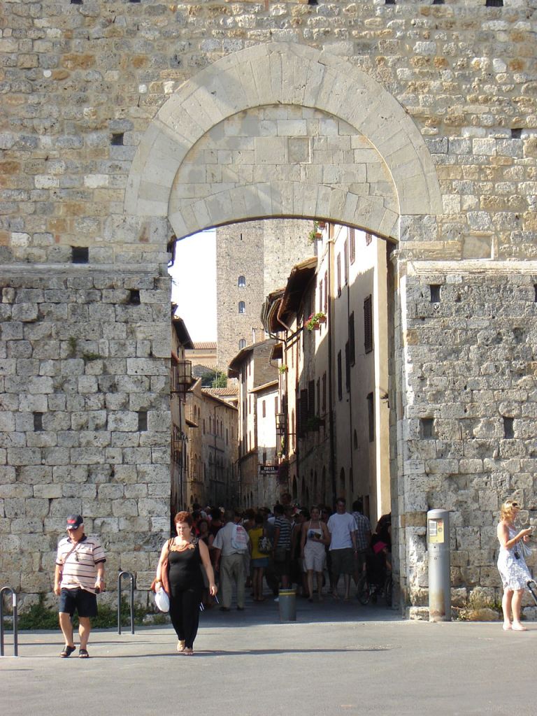 We’ll start our walk at Porta San Giovanni, the main southern gate into San Gimignano. Built in the 13th century, this stone gateway was part of the town’s defensive walls and controlled access for merchants and pilgrims traveling along the Via Francigena. Passing through the arch, you can still see the heavy stonework and imagine the wooden doors that once secured the town at night. Before moving on, take a quick look back—the view of the Tuscan countryside framed by the arch is worth a photo.