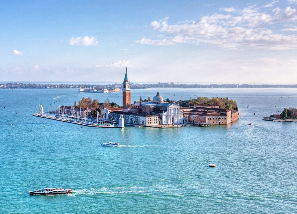 Across the water stands the island of San Giorgio Maggiore, dominated by its 16th-century church designed by Andrea Palladio. The church’s clean white façade and tall bell tower are key examples of Renaissance architecture, known for balance and symmetry.