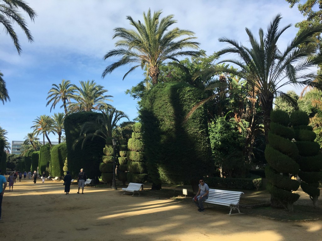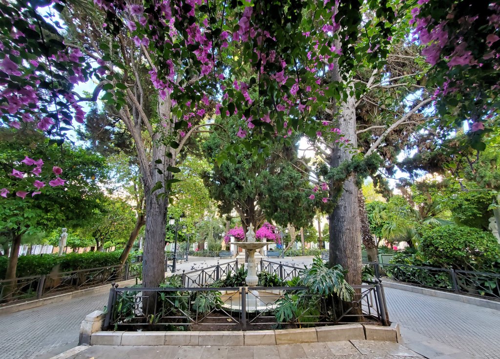 The park is almost trapezoid in shape, and if you enter through Plaza Rocío Jurado, you’ll find yourself on a wide avenue lined with double rows of flowerbeds. These beds frame oyster-stone fountains, all set among tall cypress trees and graceful date palms.