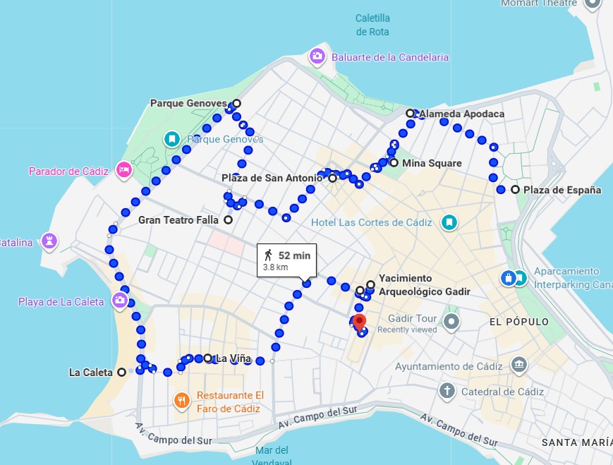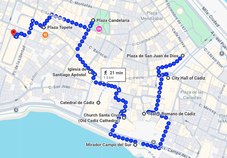 The second walk will take us from the Plaza de España to the Mercado Central, or the Cádiz Central Market. This walk is 3.6 km or just over 2 miles. It is mostly flat.